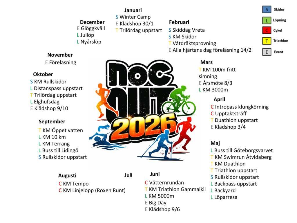 2026 är välfyllt med massor av roliga aktiviteter! I årshjulet nedan hittar du årets storheter som sticker ut lite extra. Utöver dessa aktiviteter har vi mängder av regelbundna träningspass som du hittar mer info om i kalendern.